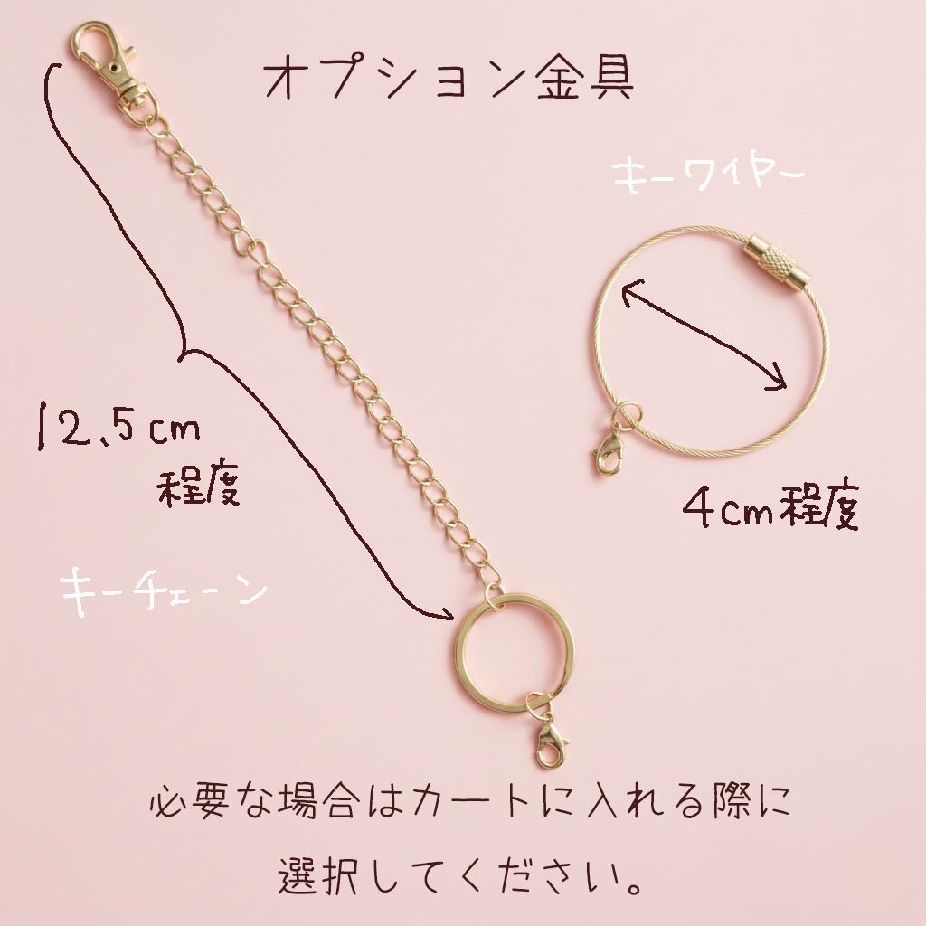 ※画像のワイヤー金具はついていません。オプションにてキーチェーンもしくはキーワイヤーを購入いただけます。(各500円)